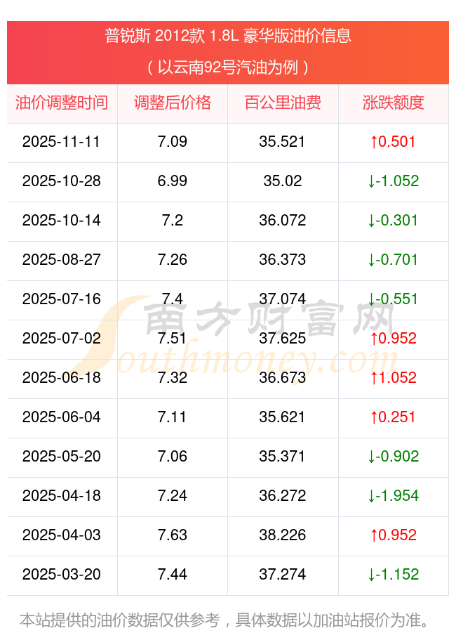 按照11月11日92號汽油最新調(diào)整價格7.09元/升來計算(以云南為例),該車型百公里平均油費為35.521元,按照上一輪10月28日調(diào)整價格6.99元/升來計算,百公里平均油費為35.02元,對比上一輪多花0.501元,下一輪油價調(diào)整時間為11月24日24時。