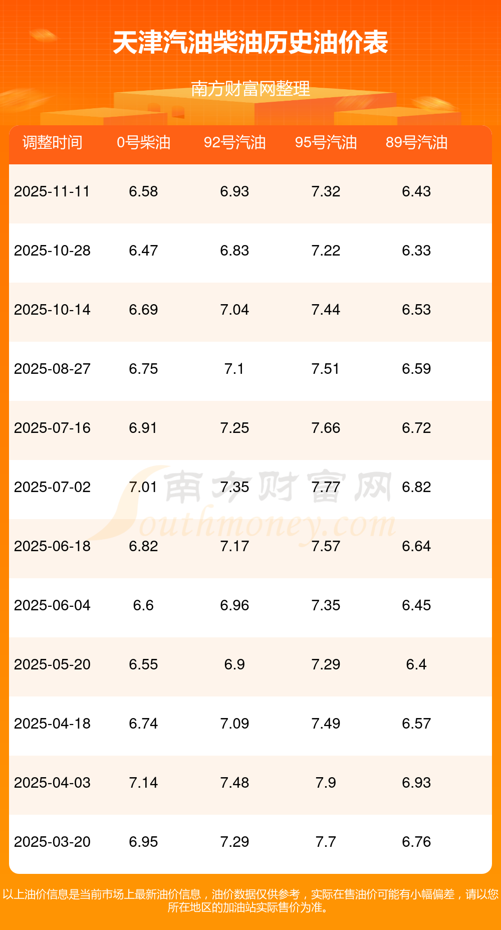 11月11日,天津92號(hào)汽油的價(jià)格是6.93元每升,本次的調(diào)整時(shí)間為11月11日,對(duì)比上次的調(diào)整上升了0.1元,上升1.464%,下次調(diào)整時(shí)間為11月24日24時(shí),還有13.42天。
