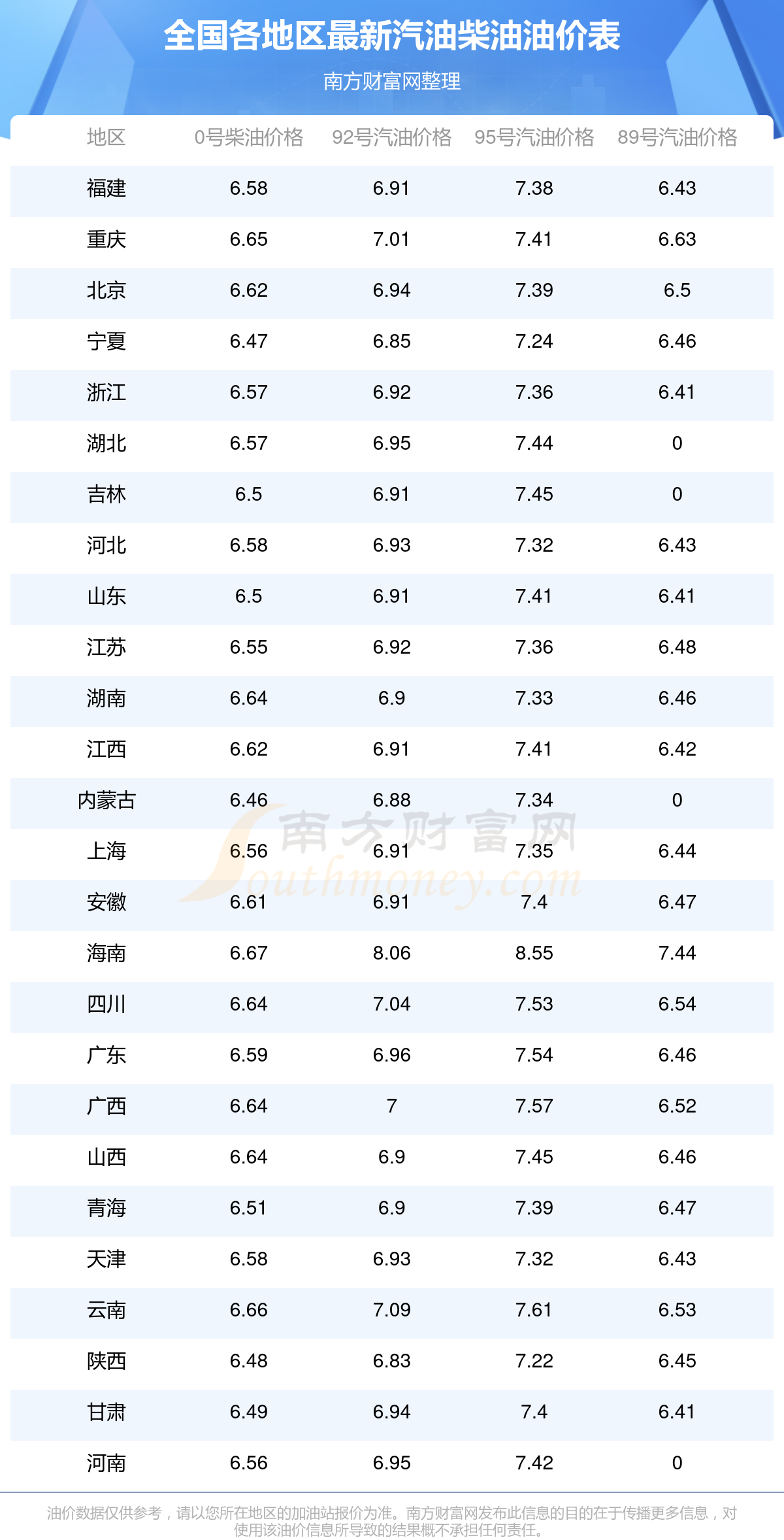 油價數(shù)據(jù)僅供參考,請以您所在地區(qū)的加油站報價為準。南方財富網(wǎng)發(fā)布此信息的目的在于傳播更多信息,對使用該油價信息所導(dǎo)致的結(jié)果概不承擔任何責(zé)任。