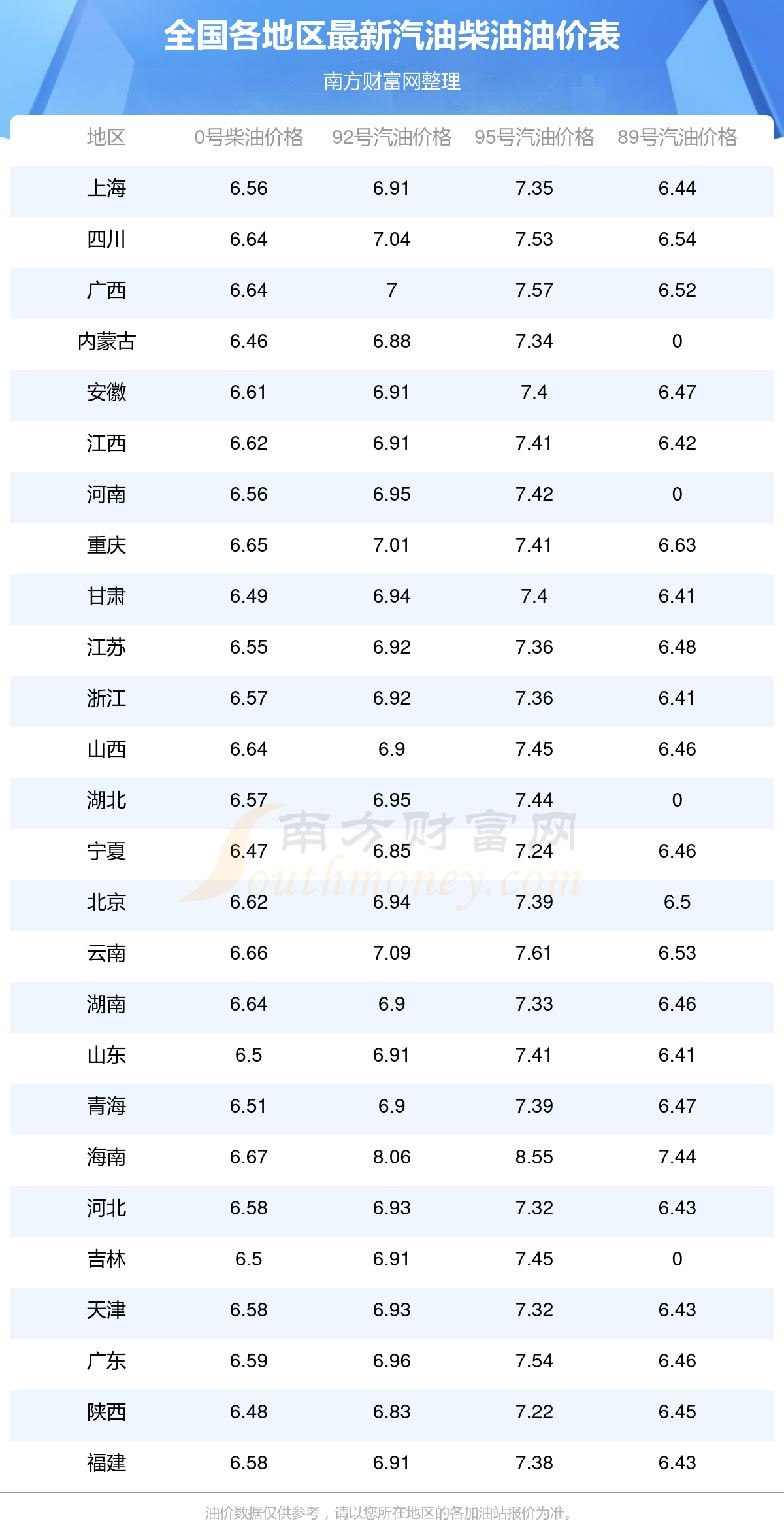 全國(guó)各地區(qū)2025年最新汽油價(jià)格表