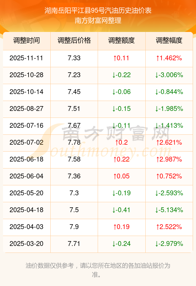 湖南岳陽(yáng)平江縣95號(hào)汽油歷史油價(jià)表