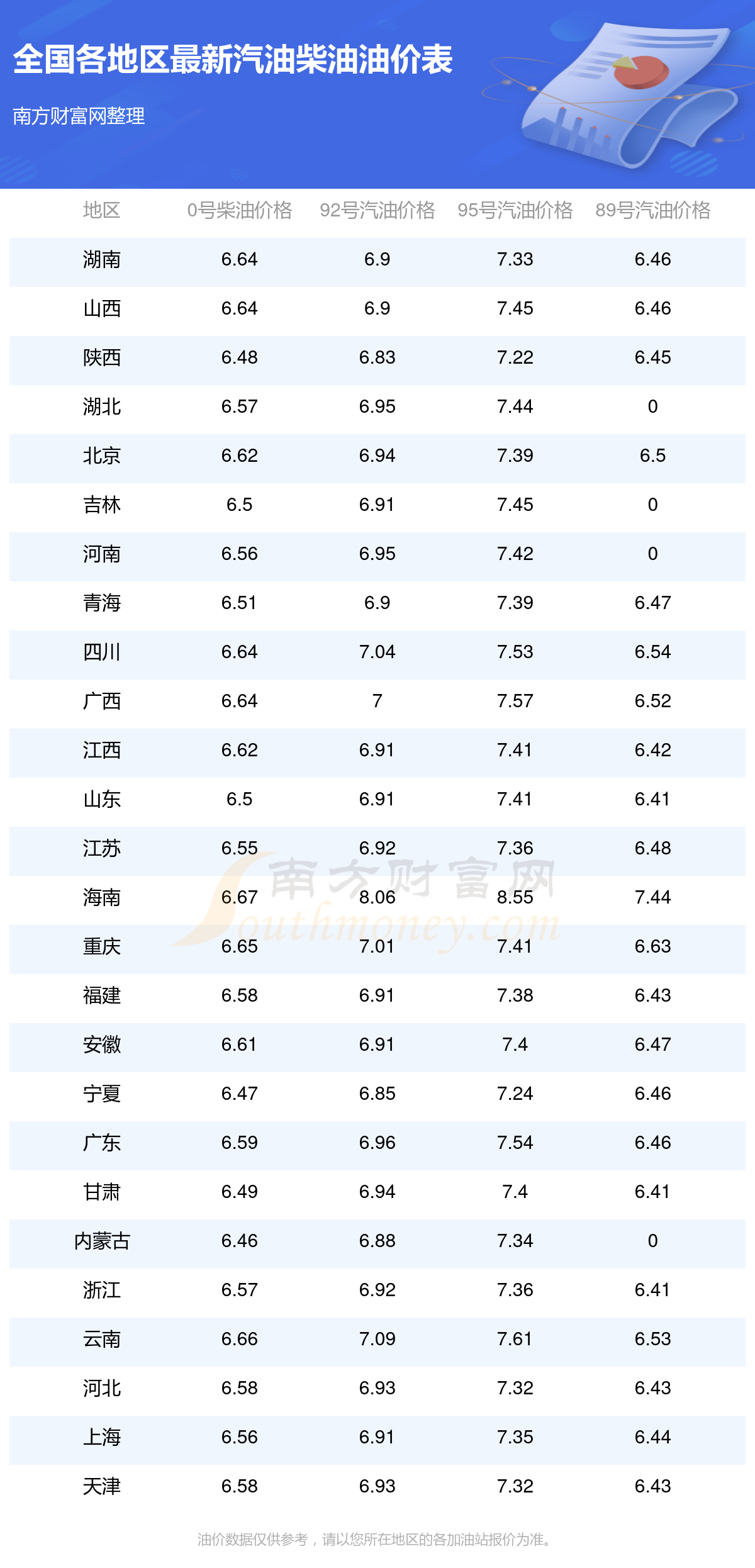 油價數(shù)據(jù)僅供參考,請以您所在地區(qū)的加油站報(bào)價為準(zhǔn)。南方財(cái)富網(wǎng)發(fā)布此信息的目的在于傳播更多信息,對使用該油價信息所導(dǎo)致的結(jié)果概不承擔(dān)任何責(zé)任。