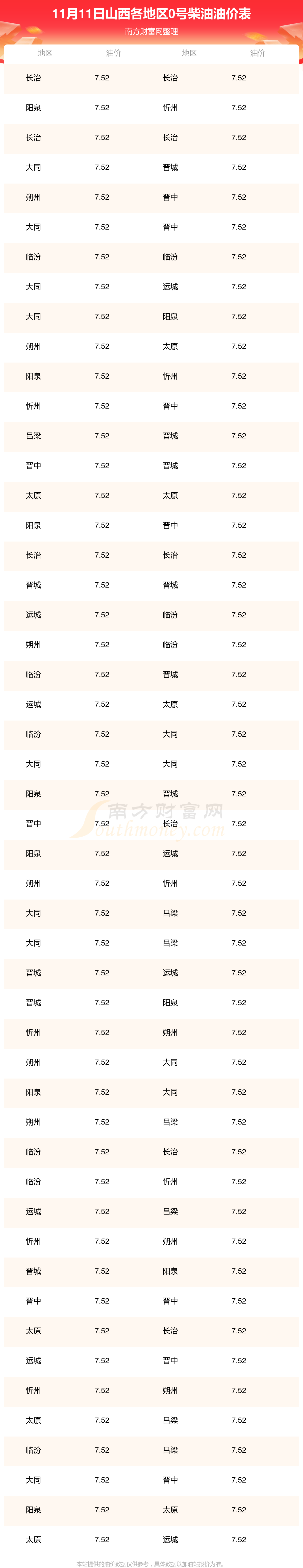 2025年11月11日山西0號(hào)柴油最新價(jià)格一覽表