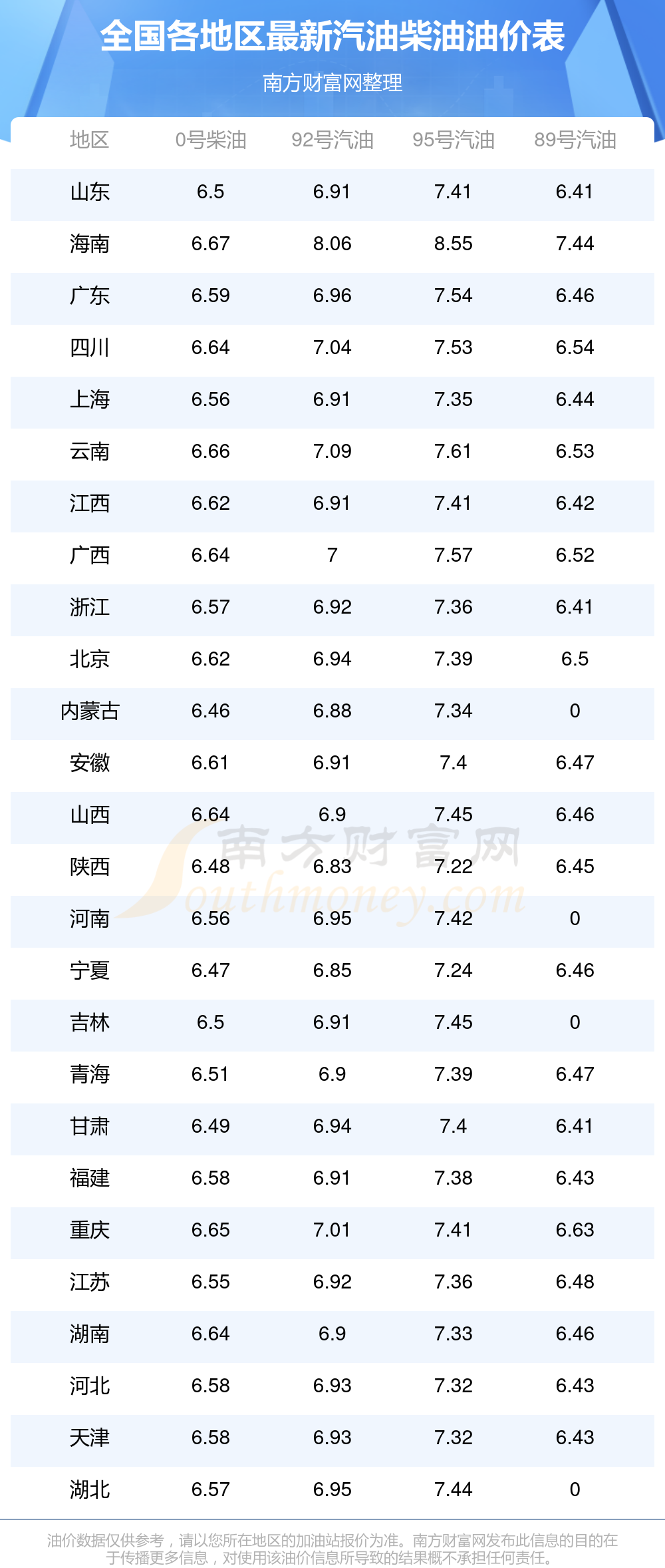 全國(guó)各地區(qū)2025年最新汽油價(jià)格表