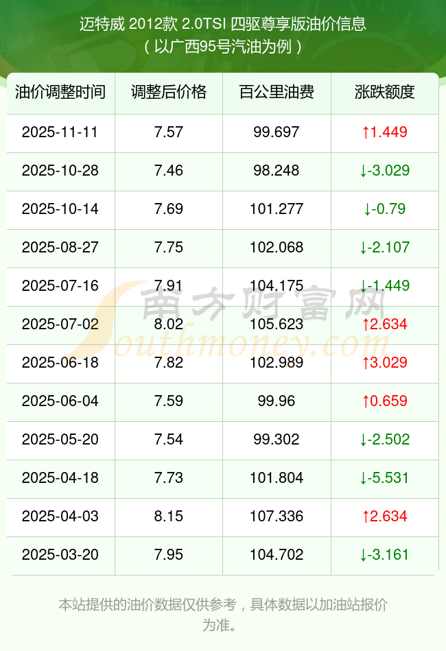 根據(jù)11月11日95號(hào)汽油最新調(diào)整價(jià)格7.57元/升來(lái)計(jì)算(以廣西為例),該車型每百公里的平均油費(fèi)是99.697元,上一輪10月28日調(diào)整價(jià)格7.46元每升來(lái)計(jì)算,每百公里的平均油費(fèi)是98.248元,對(duì)比上一輪多花1.449元,下一輪的油價(jià)調(diào)整時(shí)間是11月24日24時(shí)。