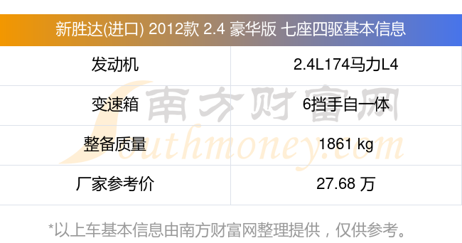 在動力上,新勝達(dá)(進(jìn)口) 2012款 2.4 豪華版 七座四驅(qū)配備的是一臺2.4L174馬力L4自然吸氣發(fā)動機(jī),匹配的是6擋手自一體自動檔變速箱,燃料形式為汽油,常規(guī)整備質(zhì)量1861kg,廠家參考價27.68萬元。