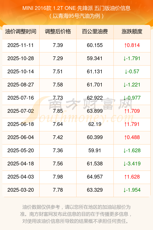 依照11月11日95號汽油最新調整價格7.39元/升來計算(以青海為例),該車型百公里的平均油費是60.155元,依照上一輪10月28日調整價格7.29元/升來計算,百公里的平均油費是59.341元,對比上一輪多花0.814元,下一輪的油價調整時間11月24日24時。