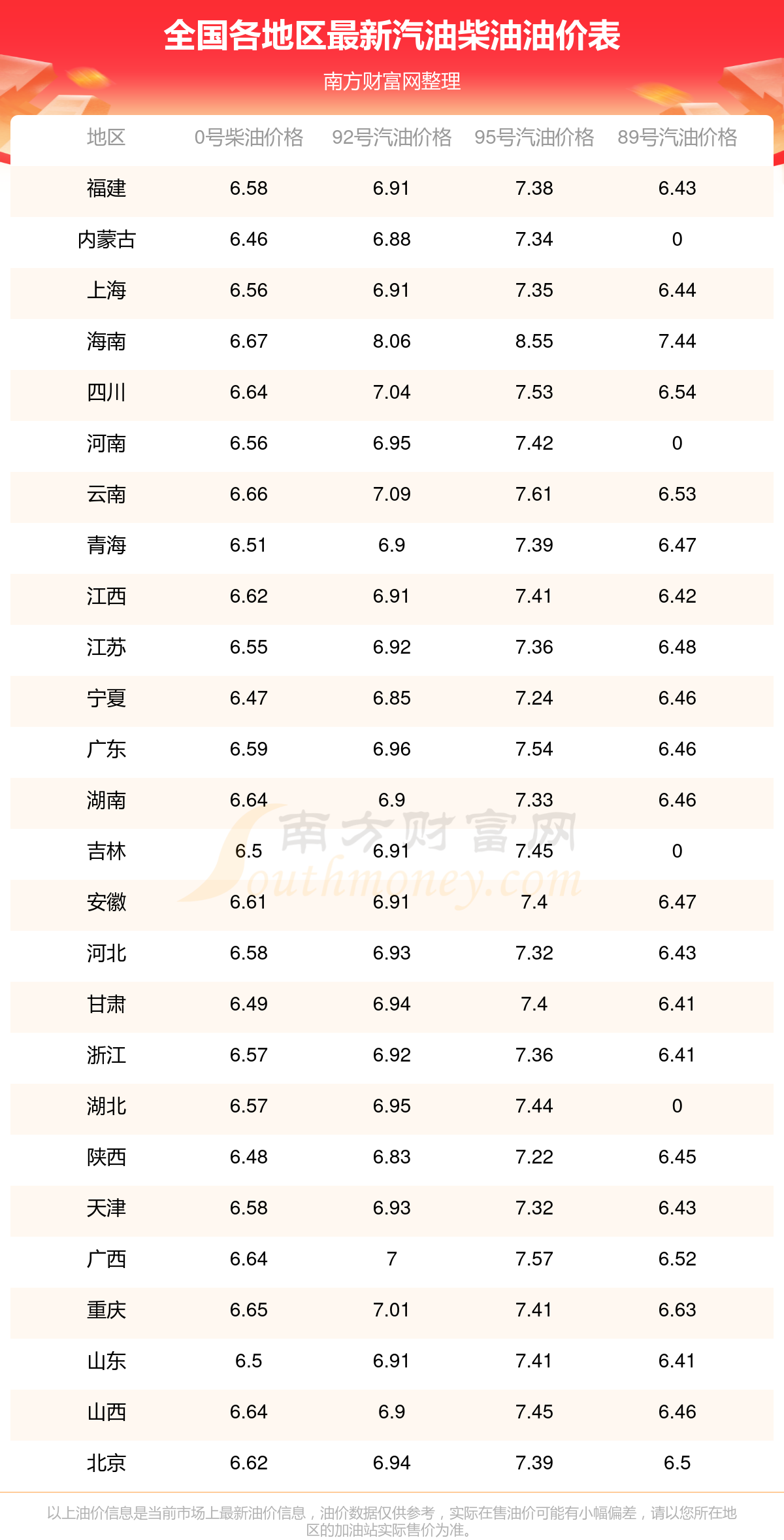本輪油價的調整時間為11月11日,調整后全國92號汽油平均價格為7元每升,其中,最低為陜西的6.83元/升,最高為海南的8.06元/升。全國95號汽油平均價格為7元每升,其中,最低為陜西的7.22元/升,最高為海南的8.55元/升。全國0號柴油平均價格為:7元每升,其中,最低為內蒙古的6.46元/升,最高為海南的6.67元/升。全國89號汽油平均價格為7元每升,其中,最低為浙江的6.41元/升,最高為海南的7.44元/升。,下一輪油價調整時間11月24日24時,距離現在還有12.49天。