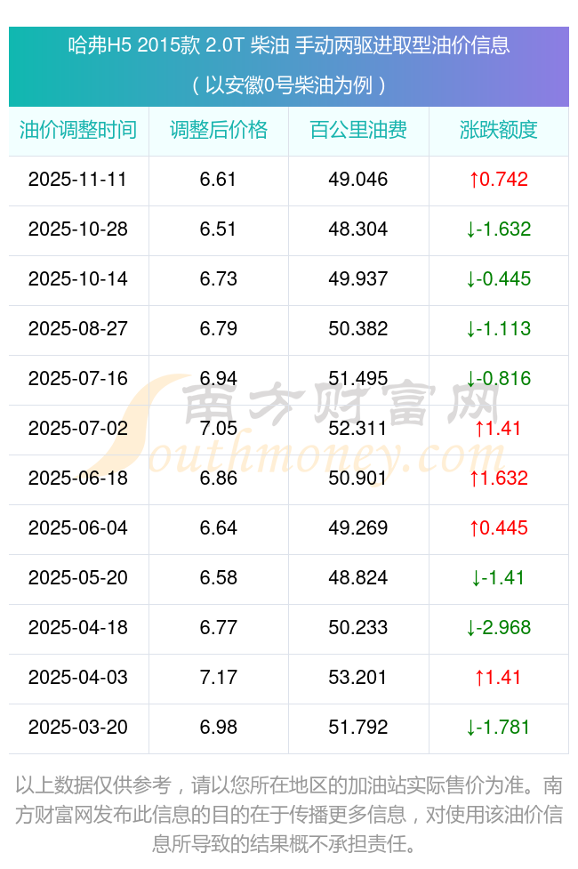 依照11月11日0號柴油最新調(diào)整價格6.61元/升來計算(以安徽為例),該車型百公里的平均油費是49.046元,依照上一輪10月28日調(diào)整價格6.51元/升來計算,百公里的平均油費是48.304元,對比上一輪多花0.742元,下一輪的油價調(diào)整時間11月24日24時。