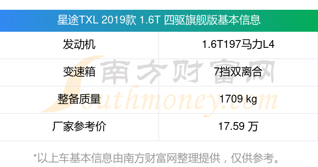 在動(dòng)力方面,星途TXL 2019款 1.6T 四驅(qū)旗艦版搭載的是一臺(tái)1.6T197馬力L4渦輪增壓發(fā)動(dòng)機(jī),匹配7擋雙離合自動(dòng)檔變速箱,燃料形式為汽油,常規(guī)整備質(zhì)量1709kg,廠家參考價(jià)17.59萬(wàn)元。