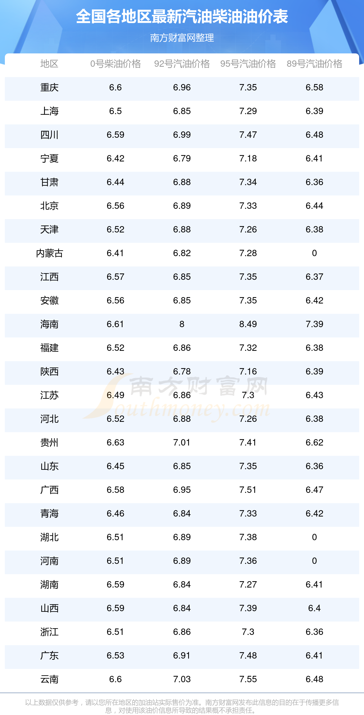2025年全國各地區(qū)最新油價表