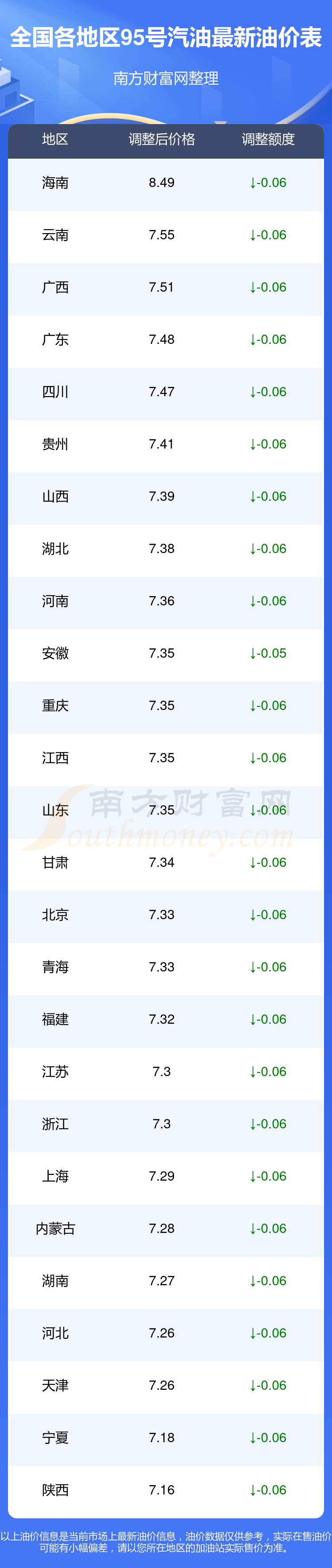 以上數(shù)據(jù)僅供參考,請(qǐng)以您所在地區(qū)的加油站實(shí)際售價(jià)為準(zhǔn)。南方財(cái)富網(wǎng)發(fā)布此信息的目的在于傳播更多信息,對(duì)使用該油價(jià)信息所導(dǎo)致的結(jié)果概不承擔(dān)責(zé)任。