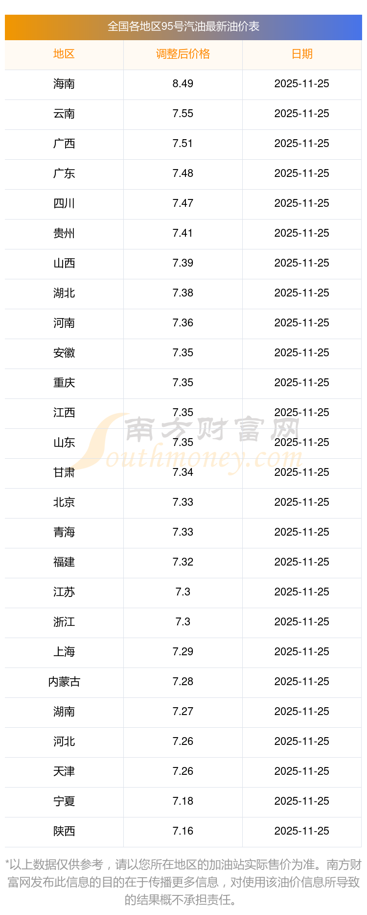 全國(guó)各地區(qū)2025年最新汽油價(jià)格表