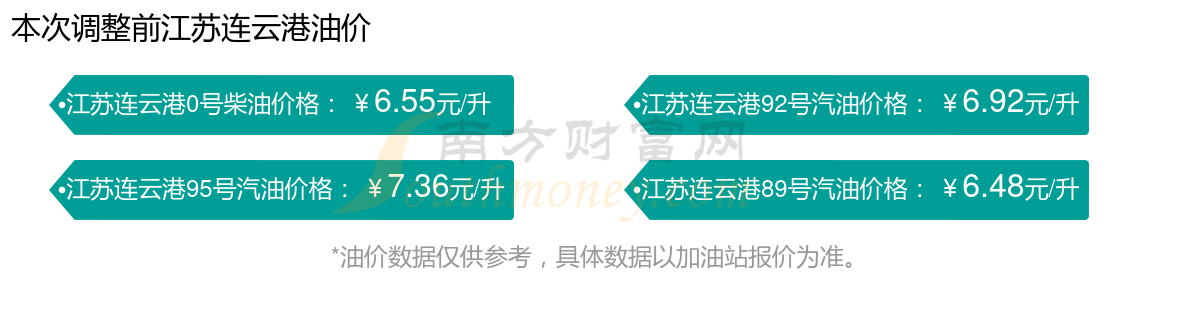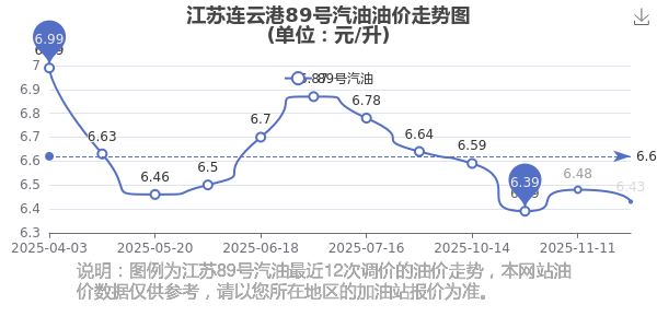 12月3日,江蘇連云港汽油、柴油每升最新價格為:調(diào)整時間為11月25日,92號汽油為6.86元,減了0.06元,減幅達0.87%;95號汽油為7.3元,減了0.06元,減幅達0.82%;89號汽油為6.43元,減了0.05元,減幅達0.77%;0號柴油為6.49元,減了0.06元,減幅達0.92%。下一輪油價調(diào)整時間12月8日24時,距離現(xiàn)在還有5.4天。