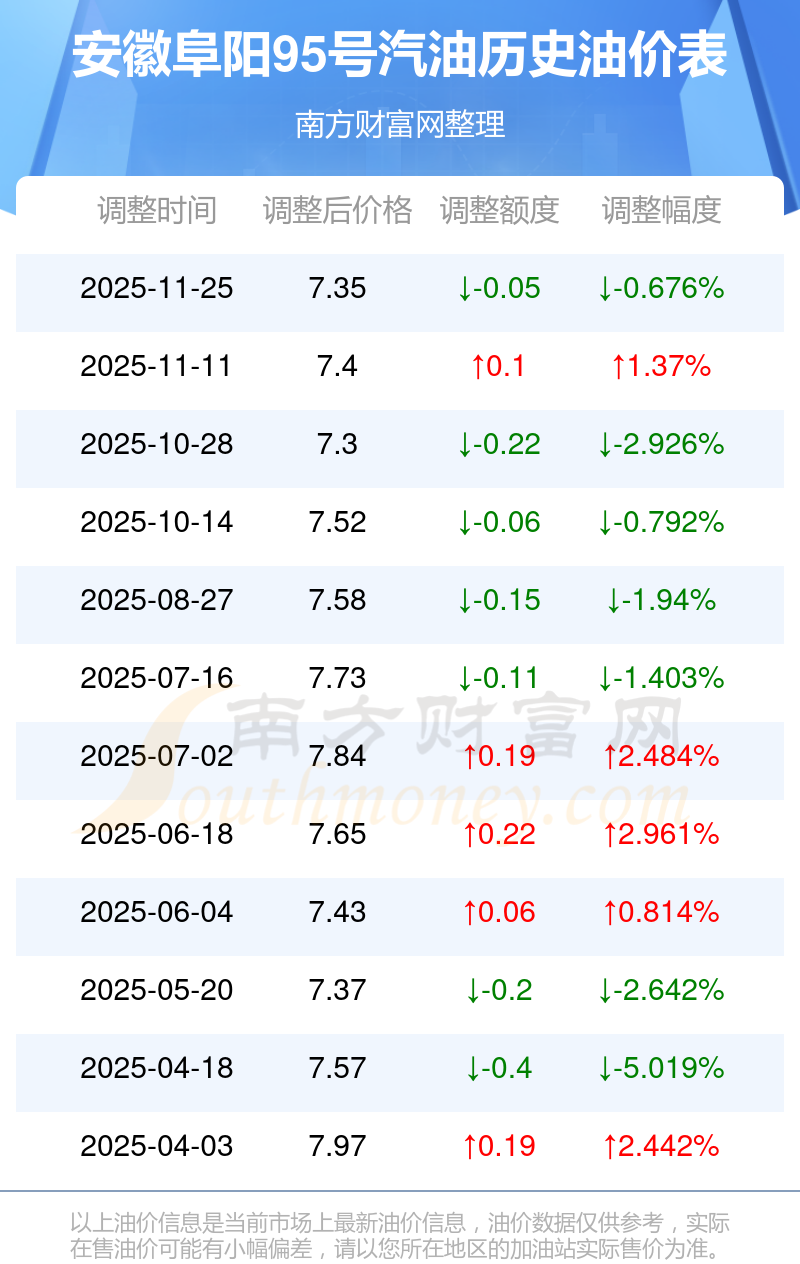 2025年95號汽油價(jià)格調(diào)整一覽表
