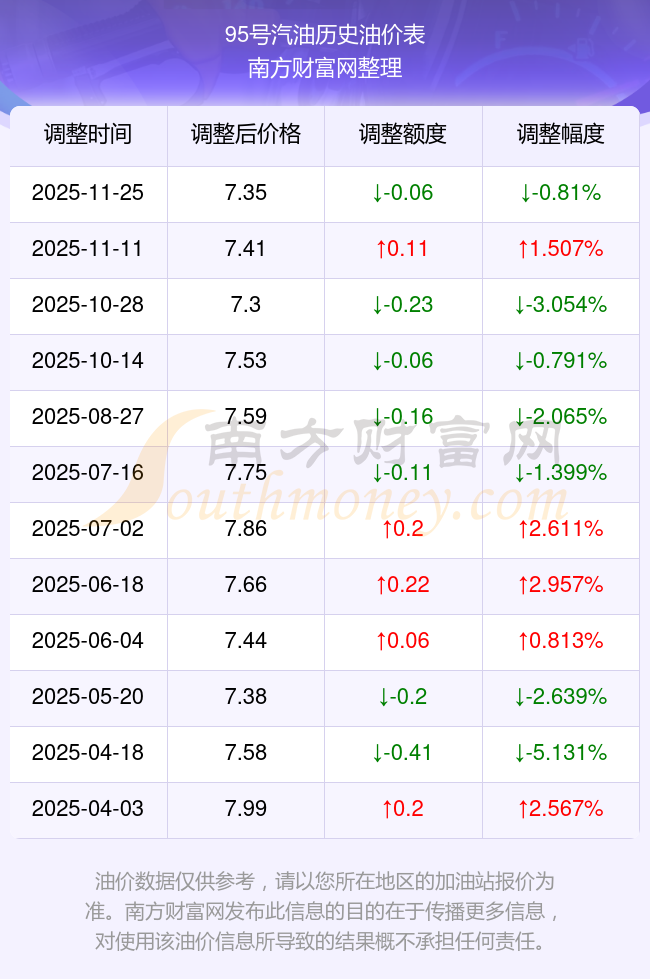 12月3日,汽油、柴油每升最新價(jià)格:調(diào)整時(shí)間為11月25日,92號(hào)汽油為6.85元,下跌了0.06元,下跌幅達(dá)0.87%;95號(hào)汽油為7.35元,下跌了0.06元,下跌幅達(dá)0.81%;89號(hào)汽油為6.36元,下跌了0.05元,下跌幅達(dá)0.78%;0號(hào)柴油為6.45元,下跌了0.05元,下跌幅達(dá)0.77%。下一輪油價(jià)調(diào)整時(shí)間12月8日24時(shí),距離現(xiàn)在還有5.39天。