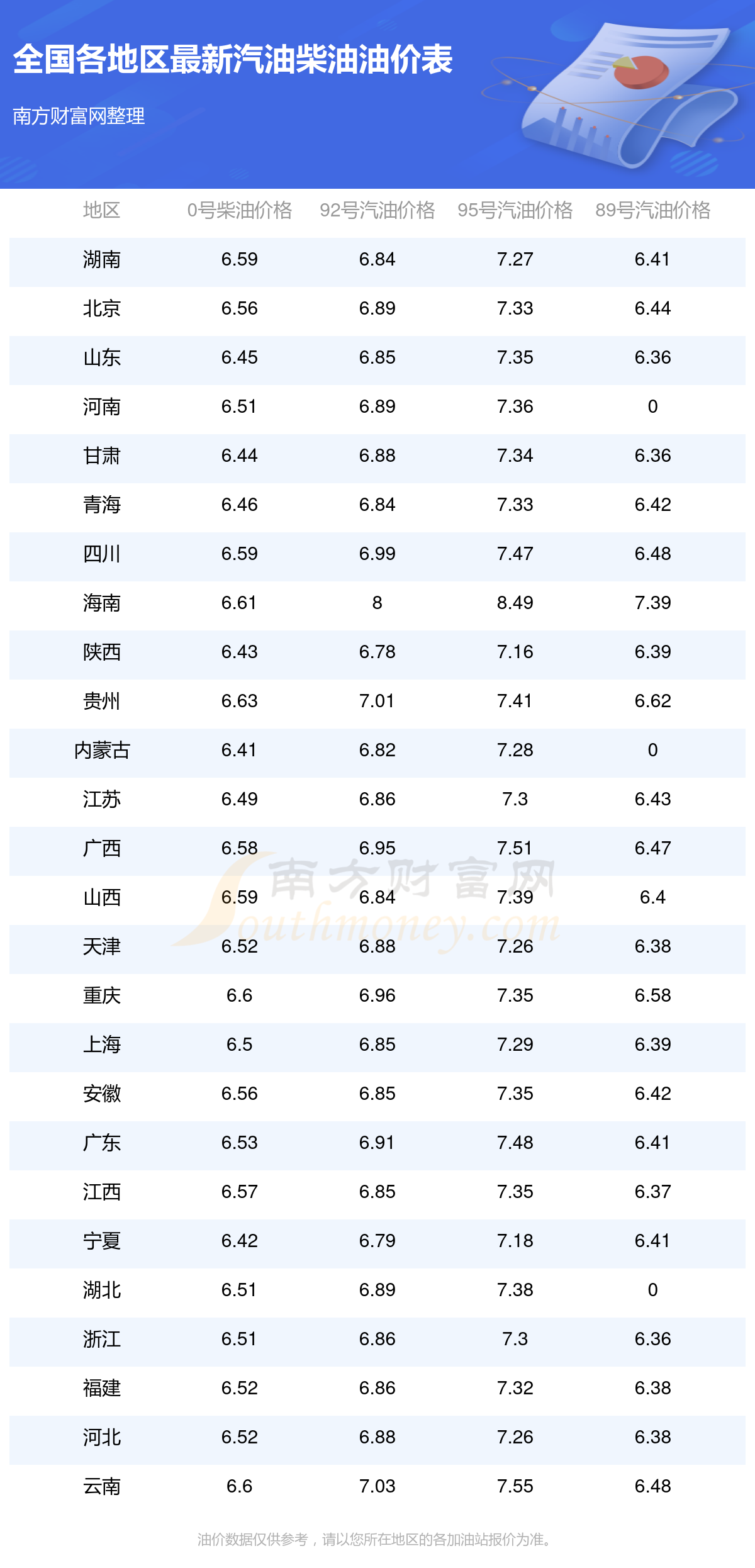 95號汽油平均價格:7元每升,其中,最高為海南,價格為8.49元/升,最低為陜西,價格為7.16元/升。
