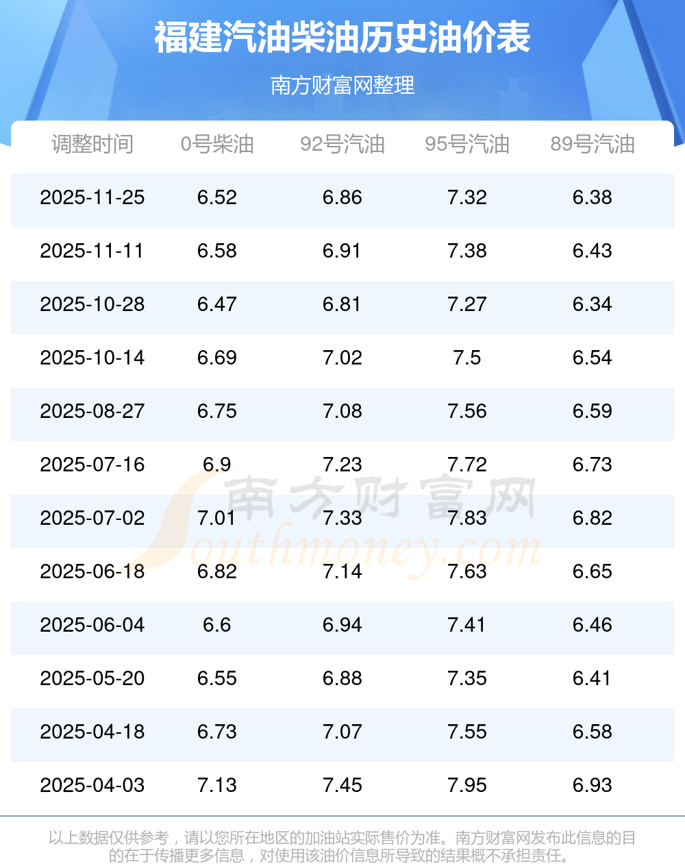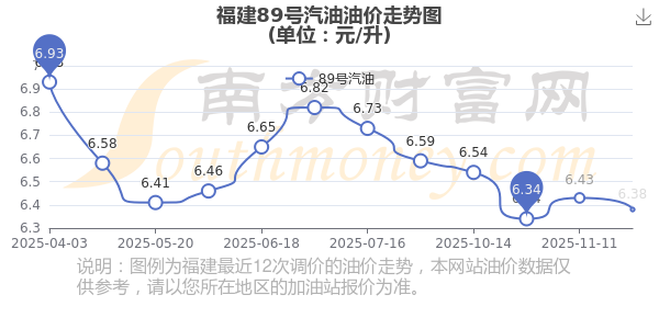 12月3日,福建89號汽油的價格是6.38元每升,本次的調(diào)整時間為11月25日,對比上次的調(diào)整跌了0.05元,跌0.778%,下次調(diào)整時間為12月8日24時,還有5.39天。