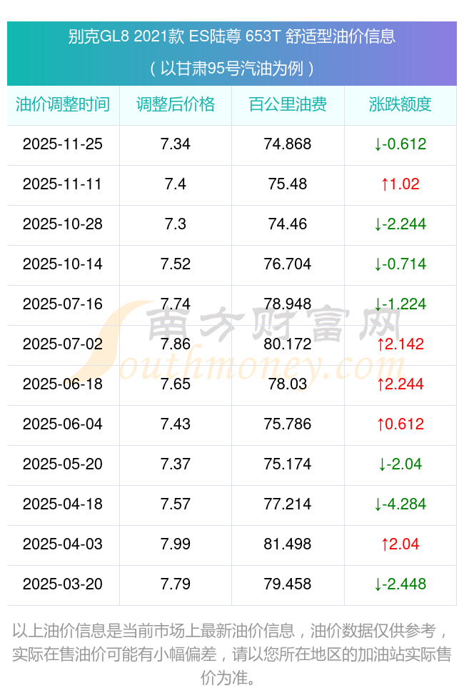 根據(jù)11月25日95號汽油最新調整價格7.34元/升來計算(以甘肅為例),該車型每百公里的平均油費是74.868元,上一輪11月11日調整價格7.4元每升來計算,每百公里的平均油費是75.48元,對比上一輪少花0.612元,下一輪的油價調整時間是12月8日24時。