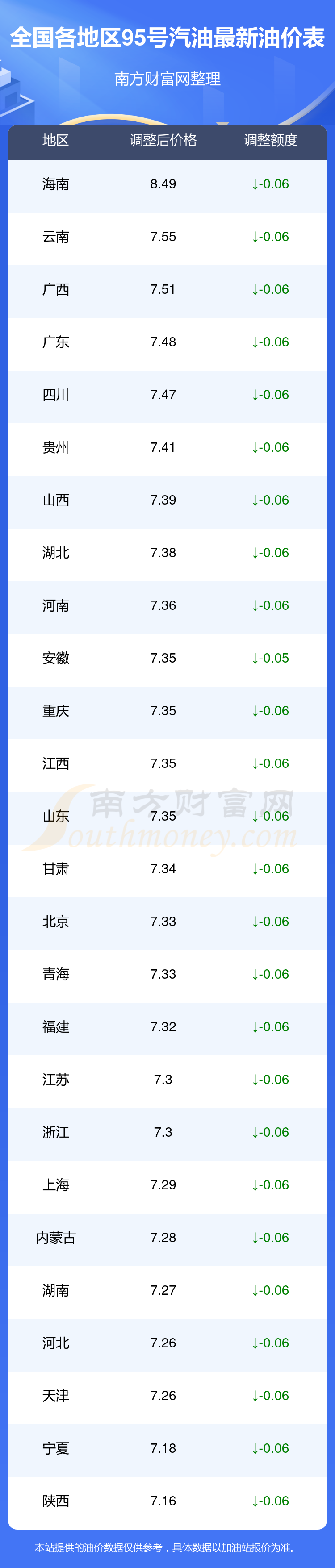 12月3日,青海95號汽油的價格是7.33元每升,本次的調整時間為11月25日,對比上次的調整減了0.06元,減0.812%,下次調整時間為12月8日24時,還有5.39天。