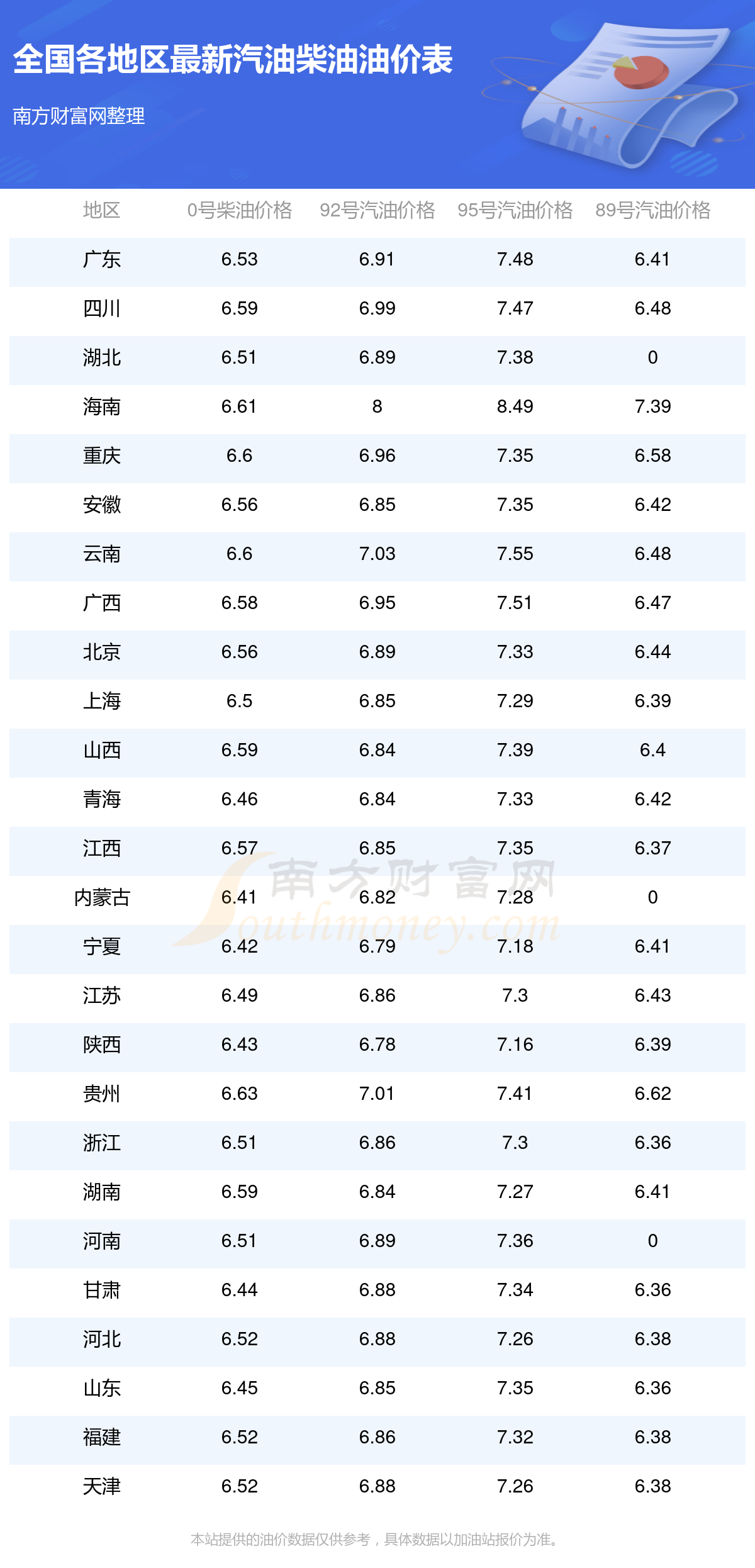 以上油價(jià)信息是當(dāng)前市場上最新油價(jià)信息,油價(jià)數(shù)據(jù)僅供參考,實(shí)際在售油價(jià)可能有小幅偏差,請以您所在地區(qū)的加油站實(shí)際售價(jià)為準(zhǔn)。