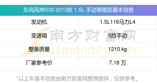 東風(fēng)風(fēng)神S30 2013款 1.5L 手動尊雅型動力上搭載的是一臺1.5L116馬力L4自然吸氣發(fā)動機(jī),匹配5擋手動擋變速箱,燃料形式為汽油,常規(guī)整備質(zhì)量1210kg,廠家參考價7.18萬元。