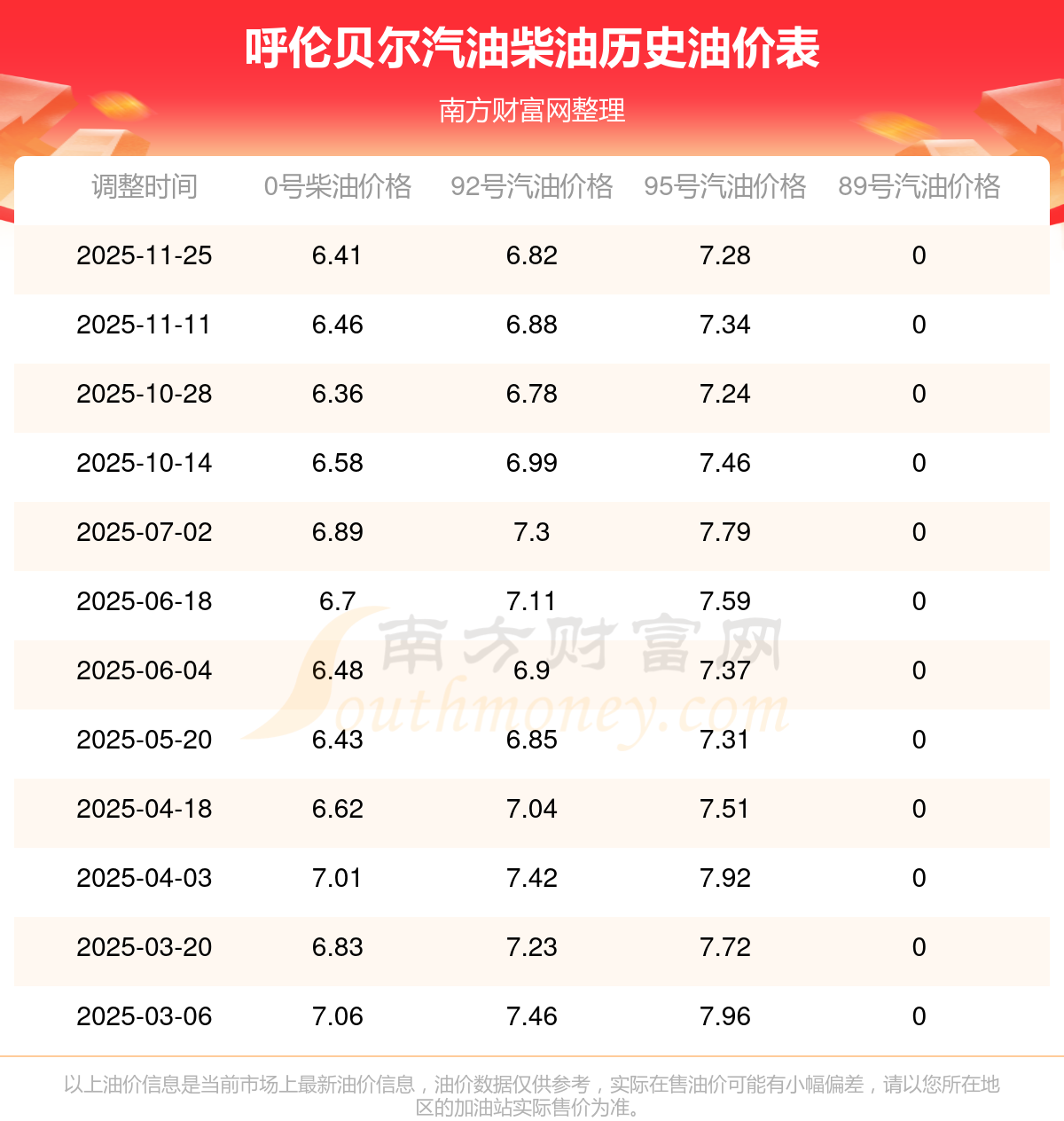 呼倫貝爾2025年汽油價(jià)格一覽表