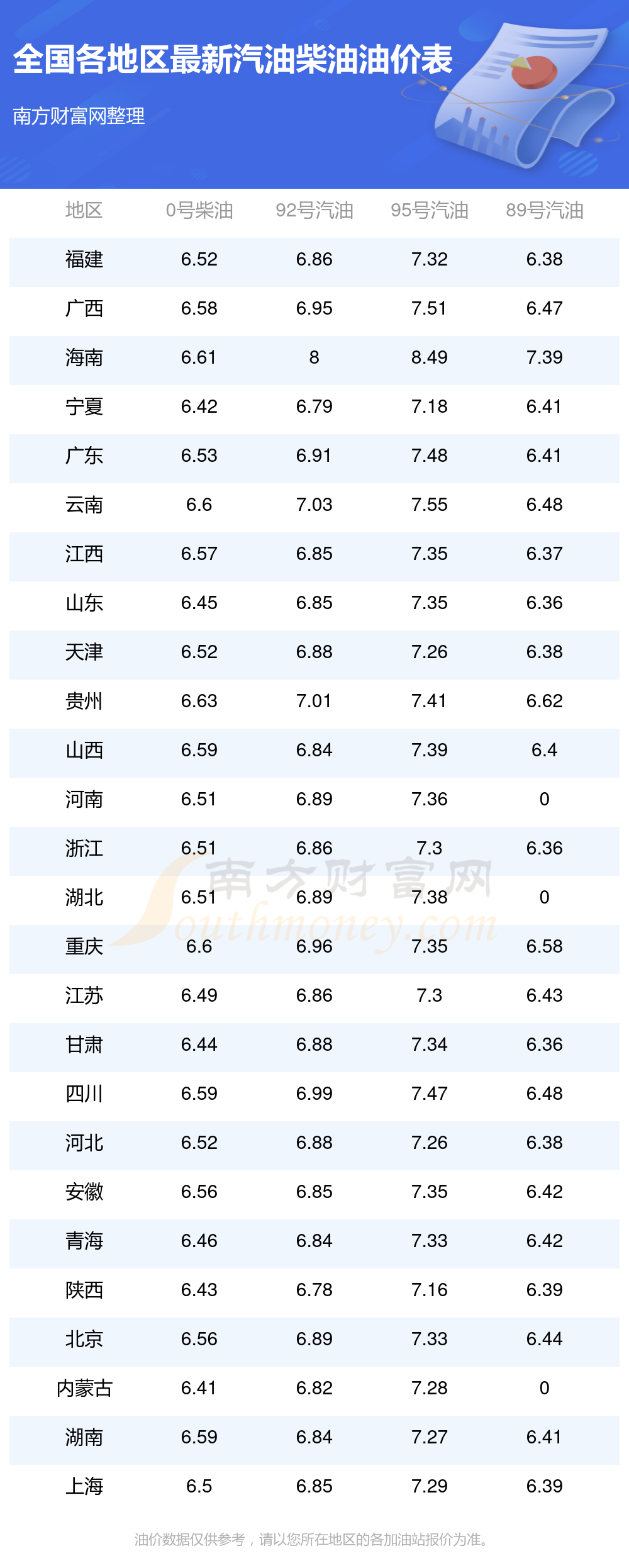 油價(jià)數(shù)據(jù)僅供參考,請(qǐng)以您所在地區(qū)的加油站報(bào)價(jià)為準(zhǔn)。南方財(cái)富網(wǎng)發(fā)布此信息的目的在于傳播更多信息,對(duì)使用該油價(jià)信息所導(dǎo)致的結(jié)果概不承擔(dān)任何責(zé)任。