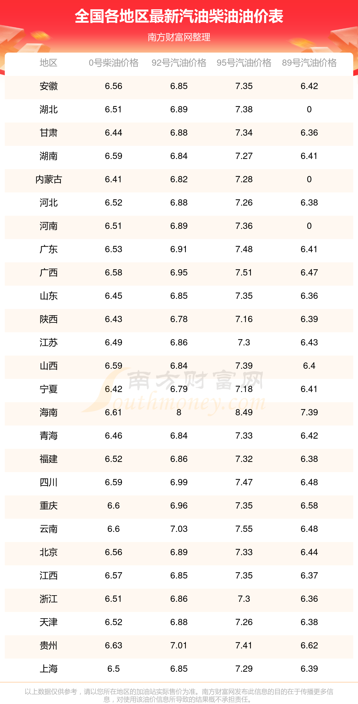 本次油價調(diào)整的時間為11月25日 ,調(diào)整后全國油價詳情如下: