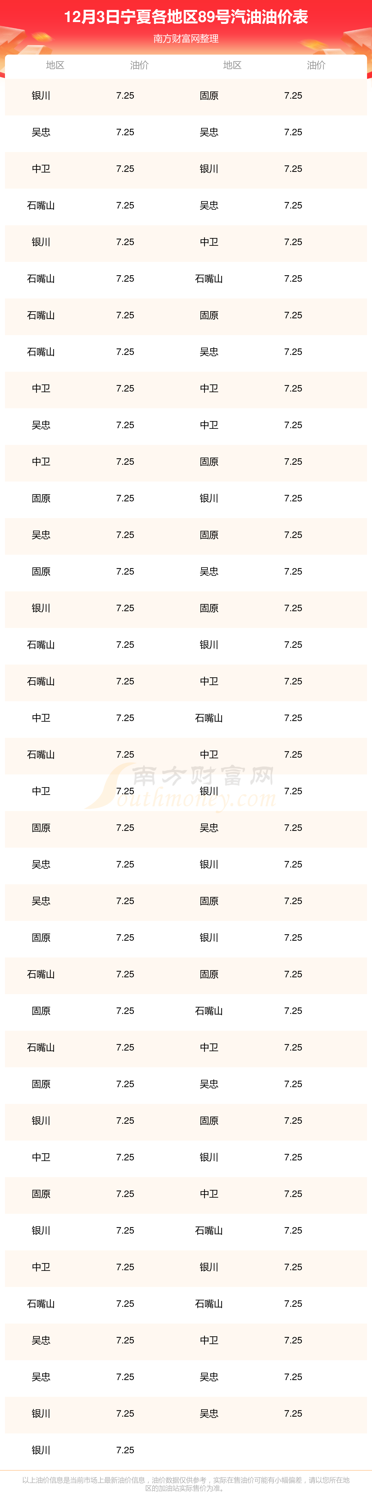 2025年12月3日寧夏89號汽油最新價格一覽表
