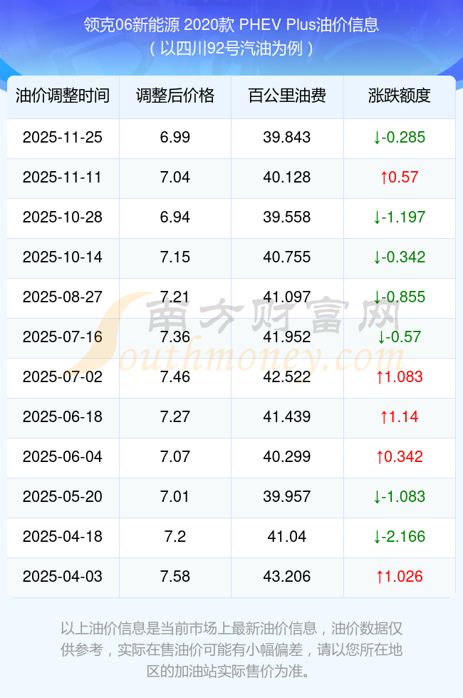 根據(jù)11月25日92號汽油最新調(diào)整價格6.99元/升來計算(以四川為例),該車型每百公里的平均油費是39.843元,上一輪11月11日調(diào)整價格7.04元每升來計算,每百公里的平均油費是40.128元,對比上一輪少花0.285元,下一輪的油價調(diào)整時間是12月8日24時。