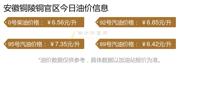 12月3日,安徽銅陵銅官區(qū)汽油、柴油每升最新價(jià)格為:92號(hào)汽油為6.85元,下降了0.06元;95號(hào)汽油為7.35元,下降了0.05元;89號(hào)汽油為6.42元,下降了0.05元;0號(hào)柴油為6.56元,下降了0.05元,調(diào)整時(shí)間為11月25日。