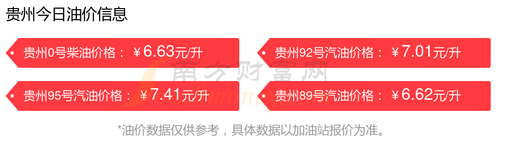 12月3日,貴州汽油、柴油每升最新價(jià)格為:92號(hào)汽油為7.01元,下降了0.06元;95號(hào)汽油為7.41元,下降了0.06元;89號(hào)汽油為6.62元,下降了0.05;0號(hào)柴油為6.63元,下降了0.06元,調(diào)整時(shí)間為11月25日。
