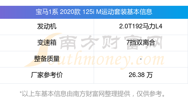寶馬1系 2020款 125i M運動套裝搭載了一臺2.0T192馬力L4渦輪增壓發(fā)動機(jī),采用7擋雙離合自動檔變速箱,廠家參考價26.38萬元。