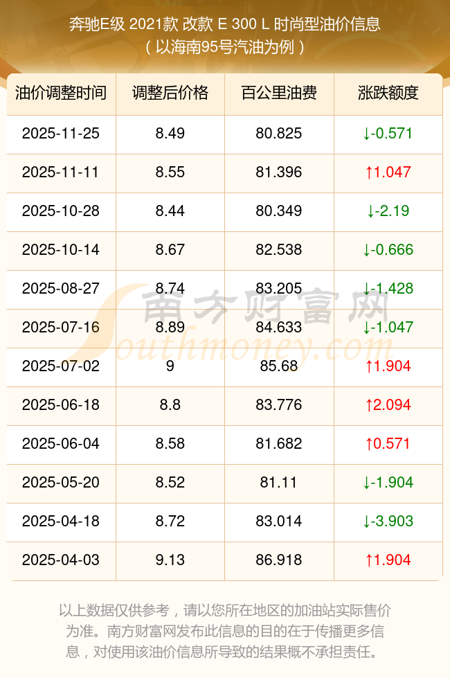根據(jù)11月25日95號汽油最新調整價格8.49元/升來計算(以海南為例),該車型每百公里的平均油費是80.825元,上一輪11月11日調整價格8.55元每升來計算,每百公里的平均油費是81.396元,對比上一輪少花0.571元,下一輪的油價調整時間是12月8日24時。