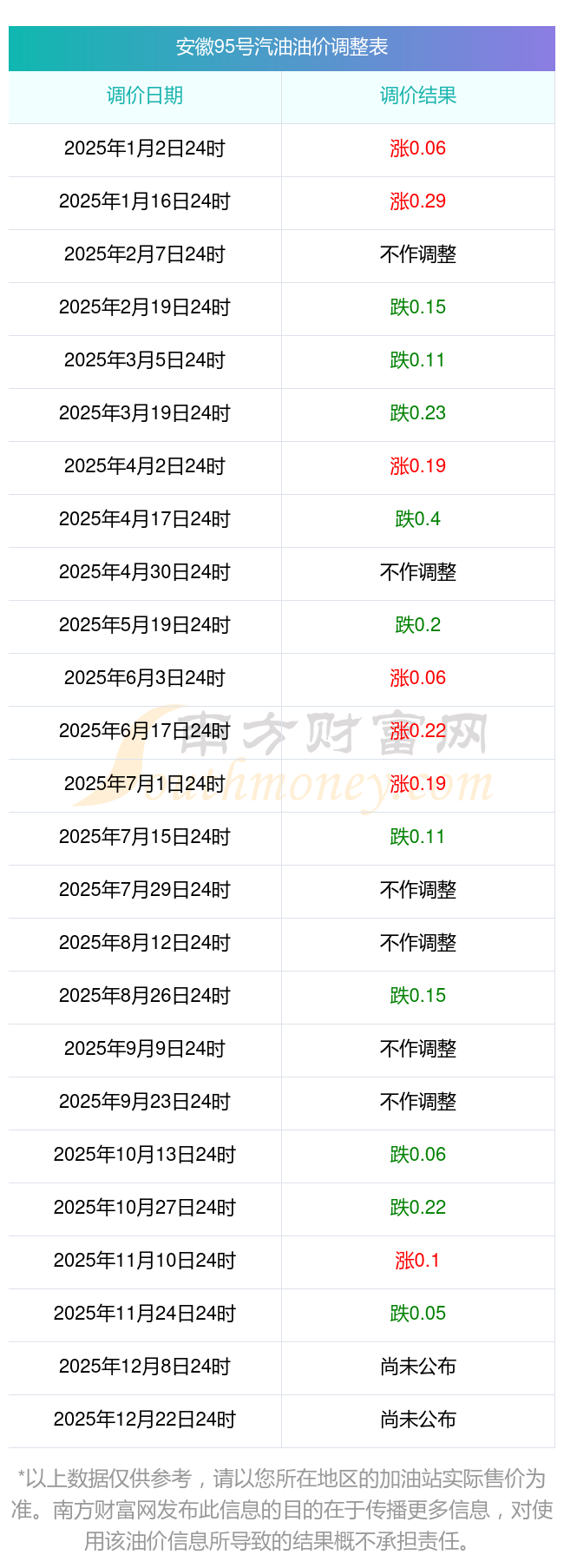 12月3日,安徽95號汽油的價格是7.35元每升,本次的調(diào)整時間為11月25日,對比上次的調(diào)整下降了0.05元,下降0.676%,12月8日24時為下一輪油價調(diào)整時間,還有5.34天。