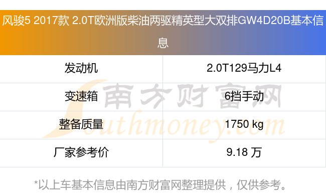 風(fēng)駿5 2017款 2.0T歐洲版柴油兩驅(qū)精英型大雙排GW4D20B搭載了一臺(tái)2.0T129馬力L4渦輪增壓發(fā)動(dòng)機(jī),采用6擋手動(dòng)擋變速箱,常規(guī)整備質(zhì)量1750kg,廠家參考價(jià)9.18萬(wàn)元。