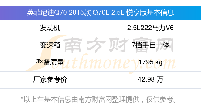 英菲尼迪Q70 2015款 Q70L 2.5L 悅享版動力上搭載的是一臺2.5L222馬力V6自然吸氣發(fā)動機,匹配7擋手自一體自動檔變速箱,燃料形式為汽油,常規(guī)整備質量1795kg,廠家參考價42.98萬元。