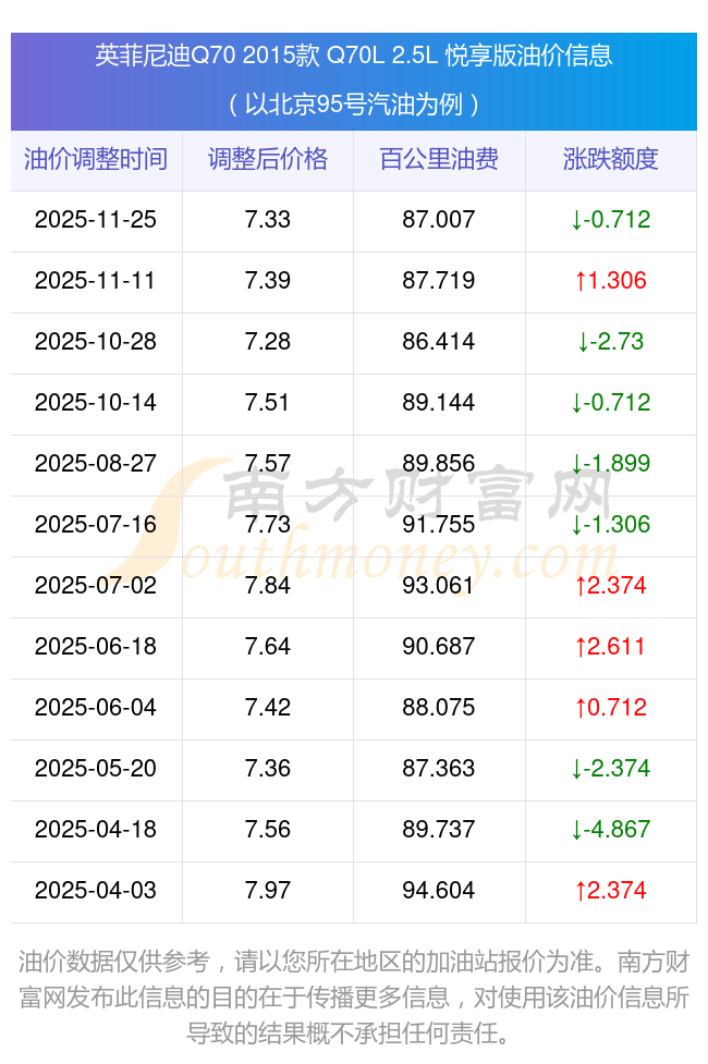 依照11月25日95號汽油最新調(diào)整價格7.33元/升來計算(以北京為例),該車型百公里的平均油費是87.007元,依照上一輪11月11日調(diào)整價格7.39元/升來計算,百公里的平均油費是87.719元,對比上一輪少花0.712元,下一輪的油價調(diào)整時間12月8日24時。