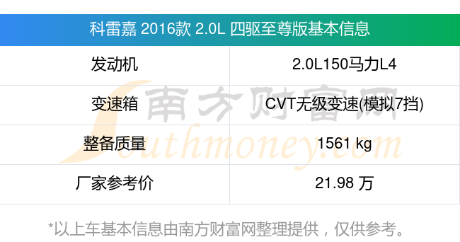 科雷嘉 2016款 2.0L 四驅(qū)至尊版動力上搭載的是一臺2.0L150馬力L4自然吸氣發(fā)動機(jī),匹配CVT無級變速(模擬7擋)自動檔變速箱,燃料形式為汽油,常規(guī)整備質(zhì)量1561kg,廠家參考價(jià)21.98萬元。