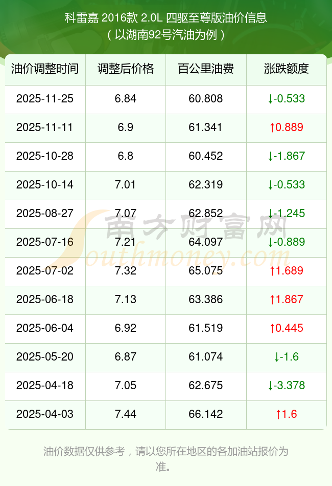 依照11月25日92號汽油最新調(diào)整價(jià)格6.84元/升來計(jì)算(以湖南為例),該車型百公里的平均油費(fèi)是60.808元,依照上一輪11月11日調(diào)整價(jià)格6.9元/升來計(jì)算,百公里的平均油費(fèi)是61.341元,對比上一輪少花0.533元,下一輪的油價(jià)調(diào)整時間12月8日24時。