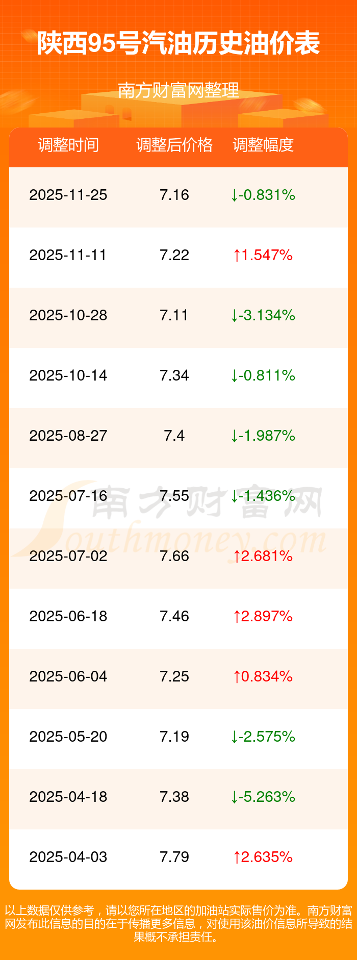 12月3日,陜西95號汽油的價格是7.16元每升,本次的調(diào)整時間為11月25日,對比上次的調(diào)整下調(diào)了0.06元,下調(diào)0.831%,12月8日24時為下一輪油價調(diào)整時間,還有5.32天。