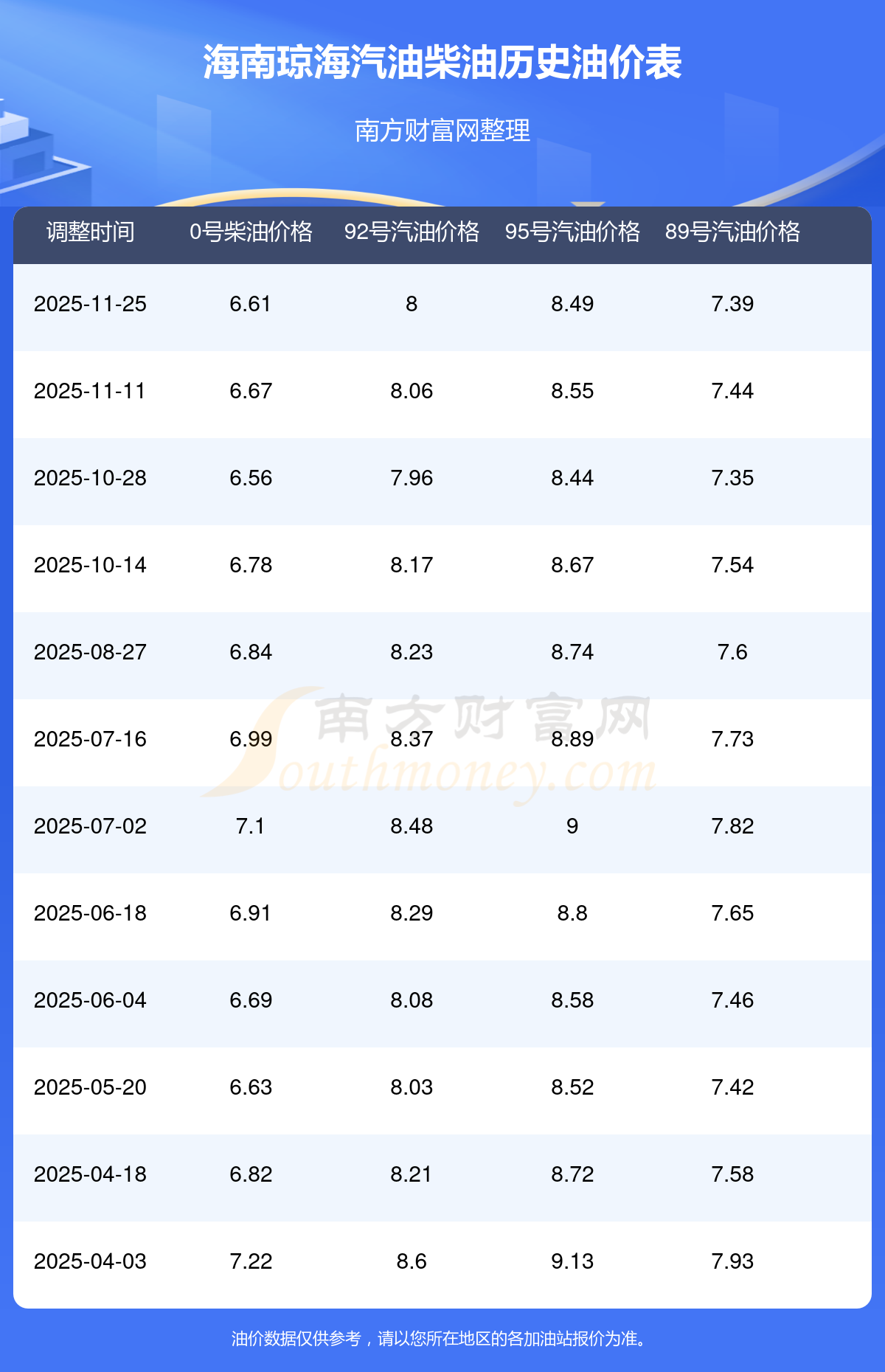 12月3日海南瓊海汽油、柴油價(jià)格是11月25日調(diào)整后的價(jià)格,每升價(jià)格具體為:92號(hào)汽油為8元,減了0.06元,減幅達(dá)0.74%;95號(hào)汽油為8.49元,減了0.06元,減幅達(dá)0.7%;89號(hào)汽油為7.39元,減了0.05元,減幅達(dá)0.67%;0號(hào)柴油為6.61元,減了0.06元,減幅達(dá)0.9%。