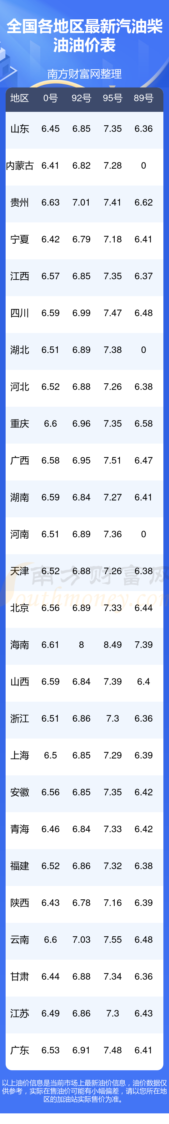 本輪油價的調(diào)整時間為11月25日,調(diào)整后全國92號汽油平均價格為7元每升,其中,最低為陜西的6.78元/升,最高為海南的8.00元/升。全國95號汽油平均價格為7元每升,其中,最低為陜西的7.16元/升,最高為海南的8.49元/升。全國0號柴油平均價格為:7元每升,其中,最低為內(nèi)蒙古的6.41元/升,最高為貴州的6.63元/升。全國89號汽油平均價格為6元每升,其中,最低為浙江的6.36元/升,最高為海南的7.39元/升。
