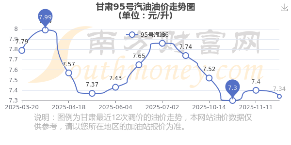 12月3日,甘肅95號(hào)汽油的價(jià)格是7.34元每升,本次的調(diào)整時(shí)間為11月25日,對(duì)比上次的調(diào)整下跌了0.06元,下跌0.811%,下次調(diào)整時(shí)間為12月8日24時(shí),還有5.29天。
