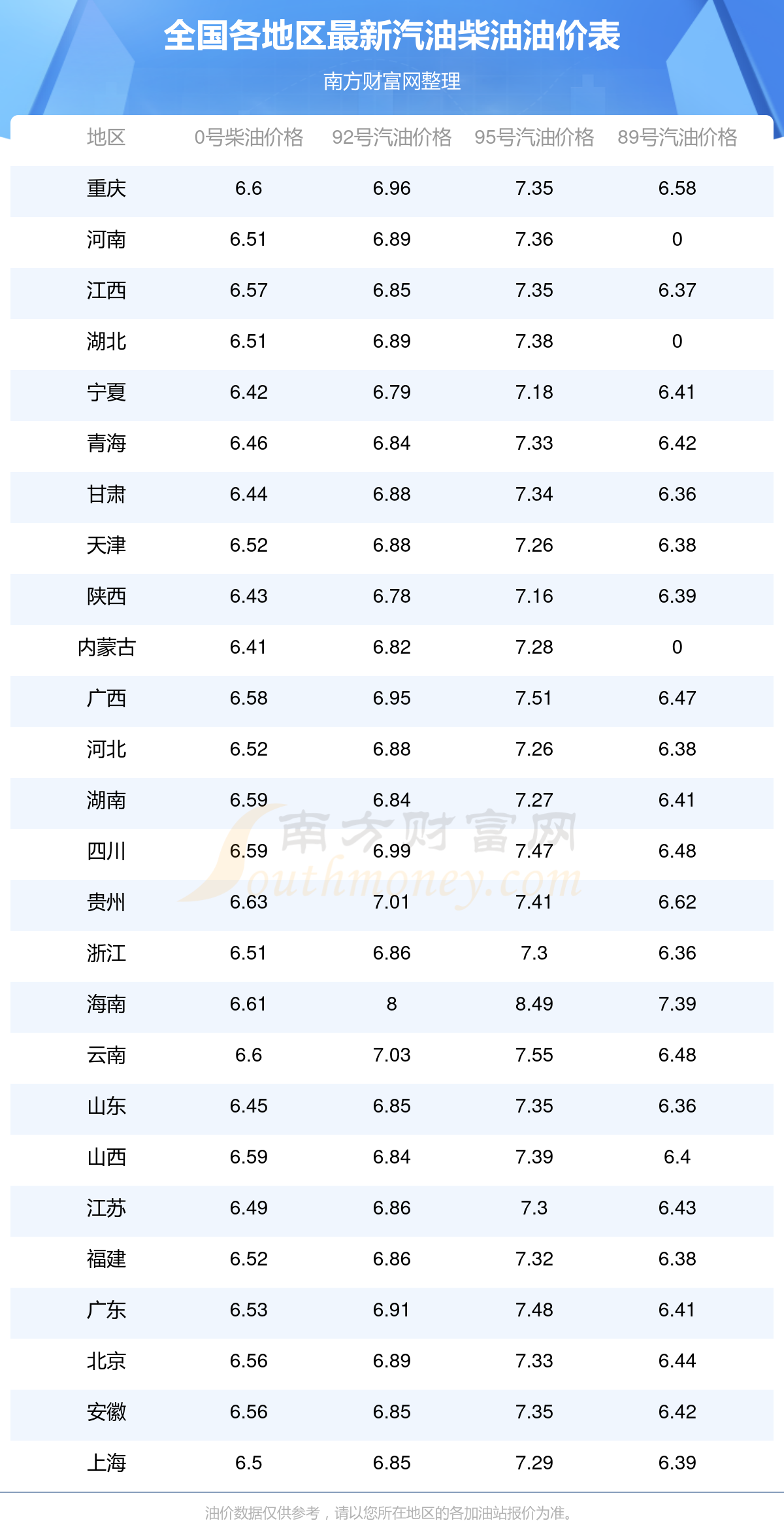 全國(guó)89號(hào)汽油最新平均價(jià)格為:6元每升,其中,最低為浙江,價(jià)格為6.36元/升,最高為海南,價(jià)格為7.39元/升。