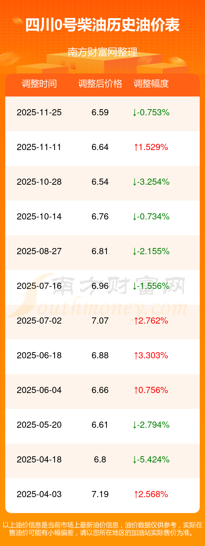 12月3日,四川0號(hào)柴油的價(jià)格是6.59元每升,本次的調(diào)整時(shí)間為11月25日,對(duì)比上次的調(diào)整下跌了0.05元,下跌0.753%,下次調(diào)整時(shí)間為12月8日24時(shí),還有5.28天。