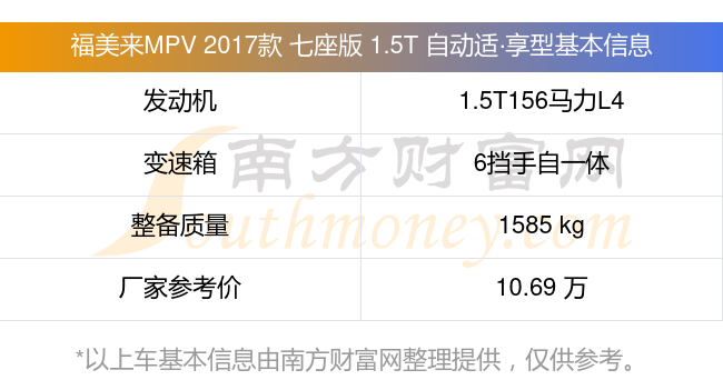 福美來MPV 2017款 七座版 1.5T 自動適·享型動力方面,搭載的是一臺1.5T156馬力L4渦輪增壓發(fā)動機(jī),匹配6擋手自一體自動檔變速箱,燃料形式為汽油,常規(guī)整備質(zhì)量1585kg,廠家參考價10.69萬元。