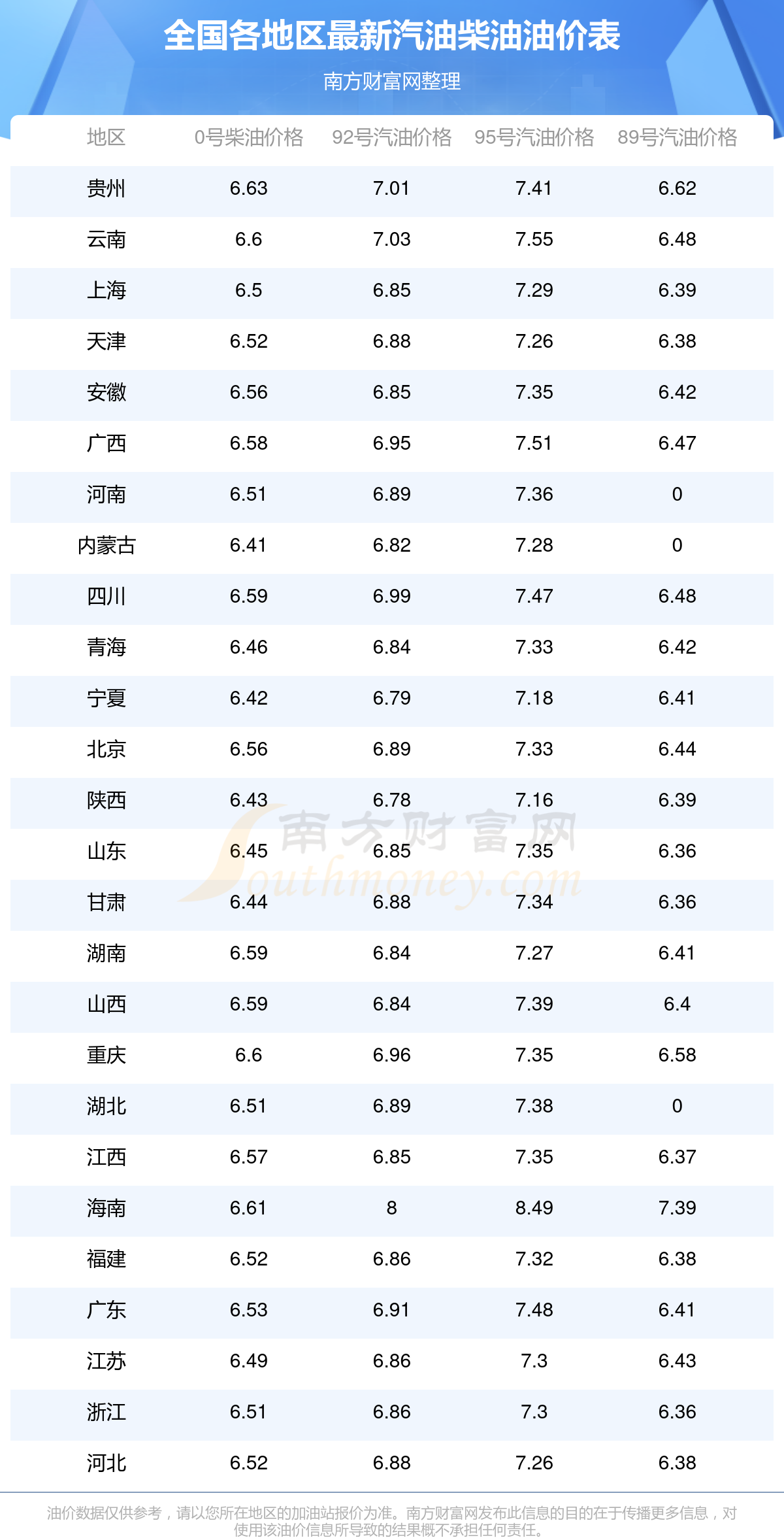 油價(jià)數(shù)據(jù)僅供參考,請(qǐng)以您所在地區(qū)的加油站報(bào)價(jià)為準(zhǔn)。南方財(cái)富網(wǎng)發(fā)布此信息的目的在于傳播更多信息,對(duì)使用該油價(jià)信息所導(dǎo)致的結(jié)果概不承擔(dān)任何責(zé)任。