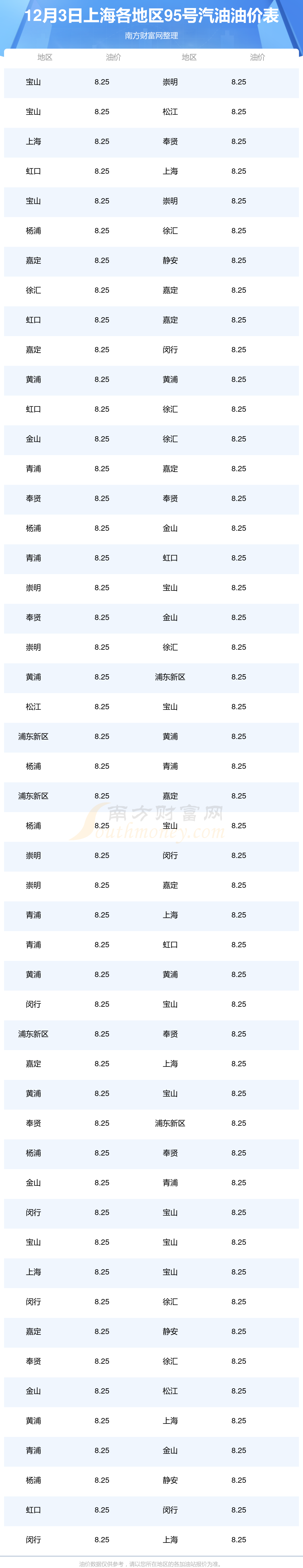2025年12月3日上海95號汽油最新價(jià)格一覽表